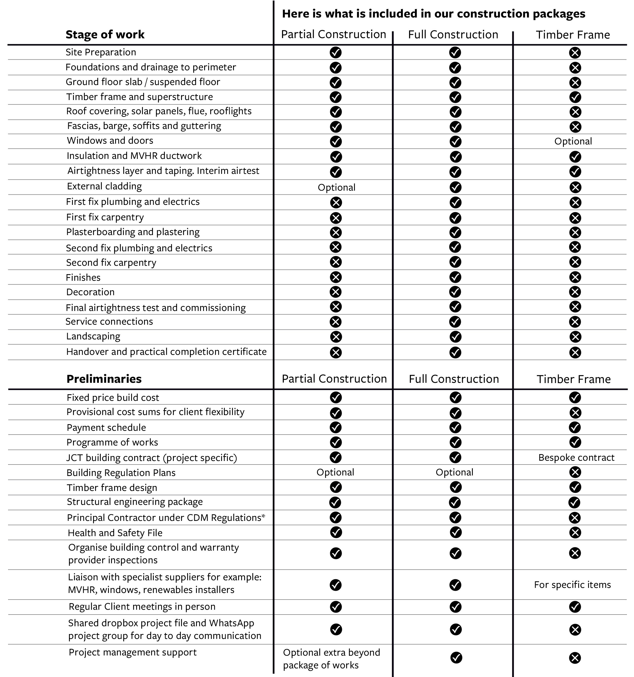 Our construction services are bespoke for each project. We can offer partial construction or turn-key construction packages as well as a one-off timber frame design, supply and erection. Please see our table below of what is included within each package of works.